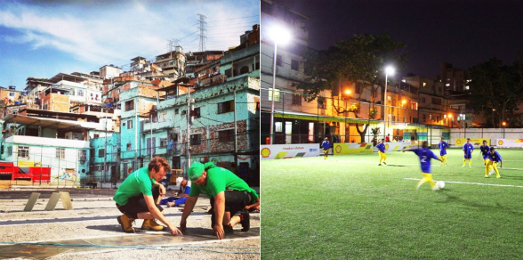• Dos canchas de fútbol, una en Nigeria con 96 baldosas y otra en medio de una favela de Brasil con 200 unidades.