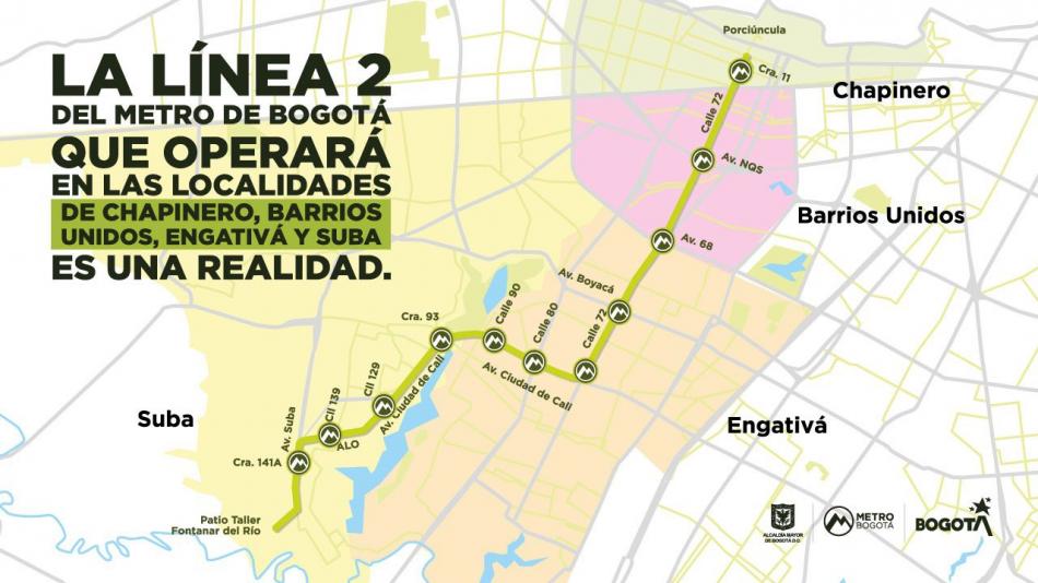 16 kilómetros, 11 estaciones y el beneficio a 2.5 millones de bogotanos, así será la segunda línea del Metro de Bogotá que será subterránea, excepto 700 metros que serán elevados, y llegará a las localidades de Chapinero, Barrios Unidos, Engativá y Suba.