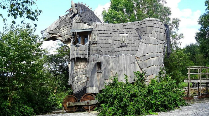 La Balade des Gnomes. Este singular hotel de tres pisos, con forma de caballo de Troya, está ubicado en Durbuy, Bélgica. Cuenta con 10 habitaciones inspiradas en cuentos y leyendas. Una de ellas parece una cama de barco flotando en el agua.