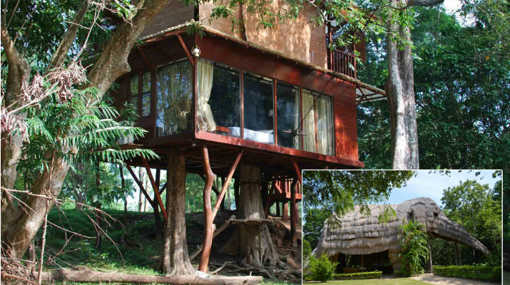 Kumbuk River Eco-Extraordinaire. En el centro del Parque Nacional Yala en Sri Lanka, se ubican 5 alojamientos ecológicos con diversos temas y arquitecturas, que van desde una villa con forma de elefante, hasta una lujosa casa del árbol.