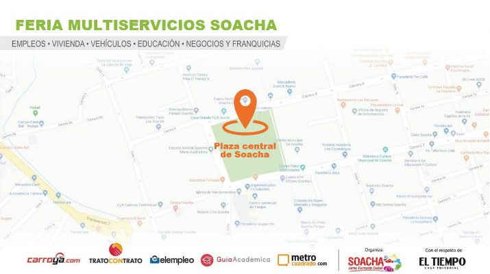 La muestra comercial de Multiservicios en Soacha, que se organiza con el respaldo de la Casa Editorial El Tiempo, estará abierta al público en el Parque Central de Soacha. Allí, metrocuadrado.com te ayudará a buscar, vender o arrendar un inmueble.