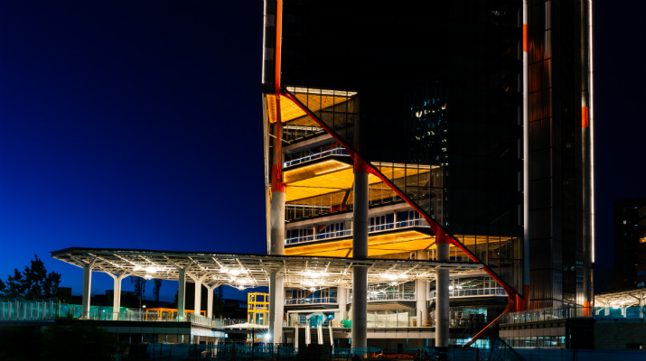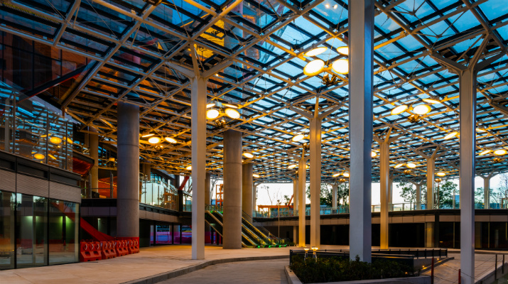 Los lobbies se convierten en una continuación de esta zona con entresuelo abierto y toldos que cubren terrazas y pabellones destinados para tiendas minoristas, cafeterías y restaurantes y áreas dedicadas para actuaciones de mayor escala, eventos, proyecciones y arte público.