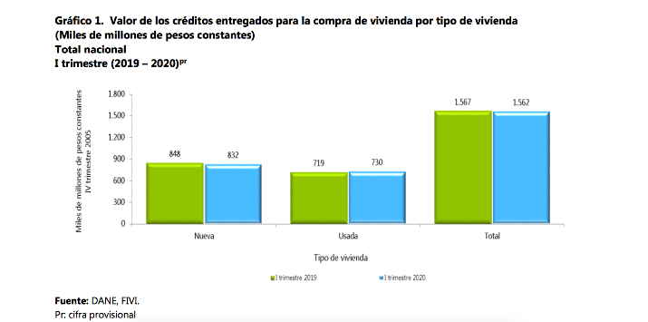El valor de los créditos desembolsados en el primer trimestre del año registró un decrecimiento de 0,3% respecto al mismo trimestre del 2019. En los créditos desembolsados para vivienda nueva se presentó una disminución de 2 %, mientras que la vivienda usada registró un crecimiento del1,6 %.