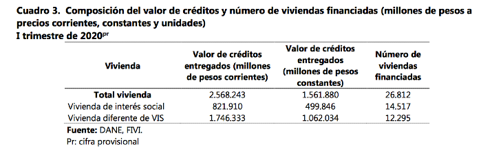 Del monto total de créditos entregados durante el primer trimestre de 2020 para compra de vivienda, el 32,0% se otorgó para la compra de vivienda VIS. En cuanto al número de viviendas financiadas, la VIS representó el 54,1% sobre el total.