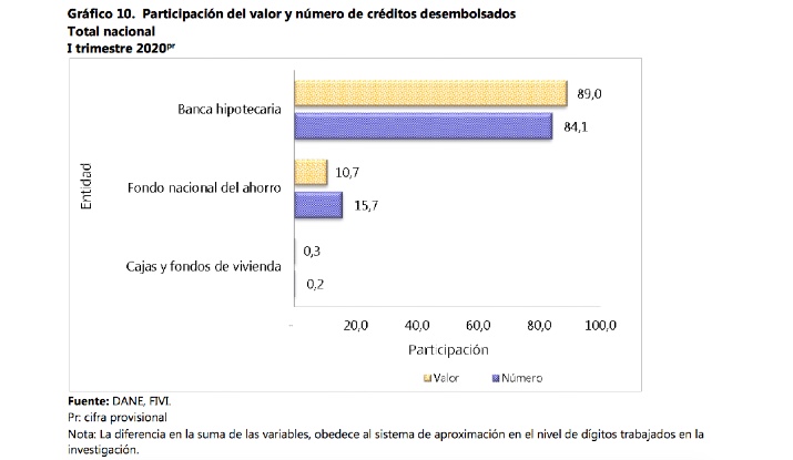 En cuanto a las entidades financieras, según el Dane, en términos de distribución del valor del crédito desembolsado para compra de vivienda en el primer trimestre de 2020, la banca hipotecaria participó con 89,0%, el Fondo Nacional del Ahorro (FNA) con 10,7% y las cajas y fondos de vivienda con 0,3%.